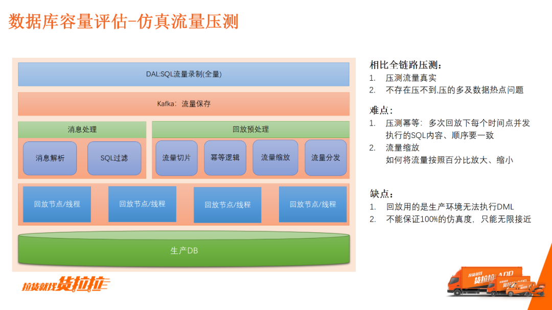在具备了全量SQL后,我们提出了仿真流量压测。它的大概流程是:高峰期内,SQL将流量录制下来保存至Kafka低峰期内,进行相应的消息处理后进行仿真回放。 主要问题: 压测幂:比如压测1000次理论上这1000次在任意时间点执行SQL的内容、数量以及并发度都要求保持一致,这是非常困难的; 流量缩放:如果是1:1的回放,理论上是可以还原的。但研发可能对放量百分比产生疑问,比如流量增加120%,数据库能否撑得住?这种时候只能通过经验预估容量。成倍放大是容易的,但成比例放大就很麻烦。 主要缺点: 使用真实生产环境进行回访,不能执行DML导致失真;不能保证100%的仿真度,只能无限接近。3.数据库容量评估应用