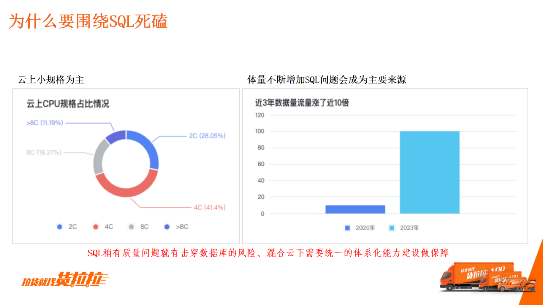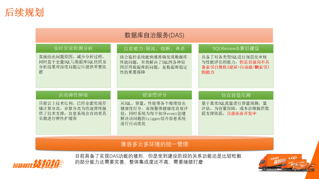 使用这种小规格的服务器,数据库的弹性能力是非常差的,SQL稍有问题都可能击穿数据库。由于使用的是混合云,无法将数据库稳定性保障交给云商统一解决,因此我们只能在现有能力下,构建兼容多云的统一管理能力。 数据库最大的两个挑战:高并发+大容量。虽然目前货拉拉还没有面临大容量与高并发的场景,但已初显端倪,不到3年,我们数据库QPS流量增长了近10倍。 在可预见的未来,如果我们的订单再增加1倍,流量可能会增加10倍,现存的SQL问题到时将会更加突出,这也是DBA围绕SQL进行能力建设的原因之一。 5.后续规划