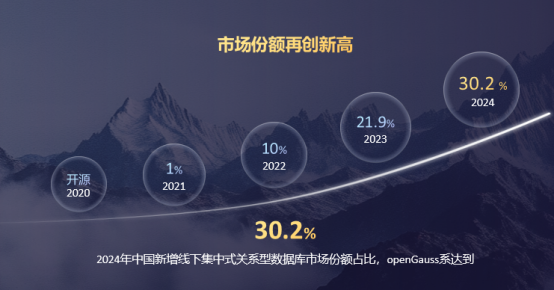 行业持续突破,商业拓展再创新高 今年openGauss发展进入一个高速增长阶段,根据弗若斯特沙利文最新调研报告显示,2024年线下集中式关系型数据库新增市场份额,openGauss系再创新高,达30.2%,生态发展进入高速增长阶段。