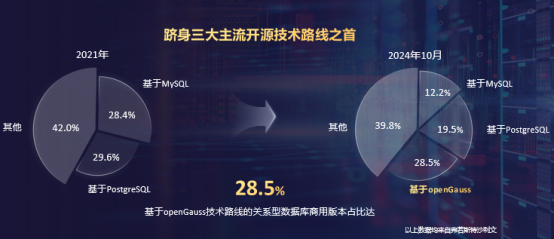 该报告调研123家关系型数据库,其中35家数据库厂家基于openGauss开源数据库构筑自己的商用发行版,比例达28.5%,超过MySQL和PG,成三个主流开源技术路线之首。其中,商业发行版2024年增长了50%,从10家发展到15家,企业自用版增长了5倍,从4家发展到20家,众多行业头部企业核心业务都替换成了openGauss系数据库。