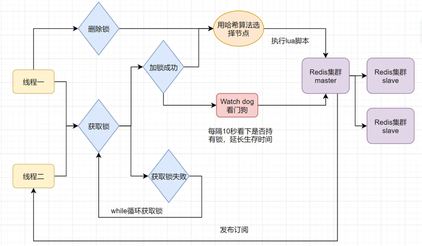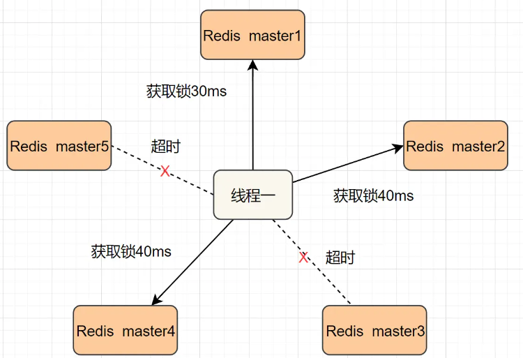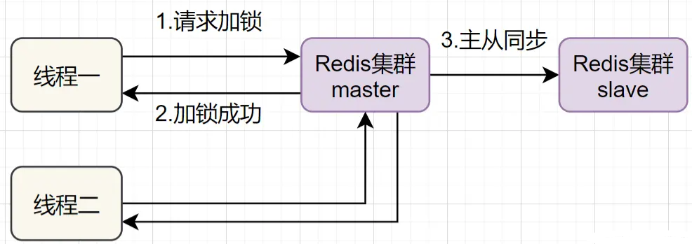 如果key不存在,通过hash的方式保存,同时设置过期时间,反之如果存在就是+1。对应的就是hincrby, KEYS[1], ARGV[2], 1这段命令,对hash结构的锁重入次数+1。 Redlock+Redisson如果线程一在Redis的master节点上拿到了锁,但是加锁的key还没同步到slave节点。恰好这时,master节点发生故障,一个slave节点就会升级为master节点。线程二就可以获取同个key的锁啦,但线程一也已经拿到锁了,锁的安全性就没了。