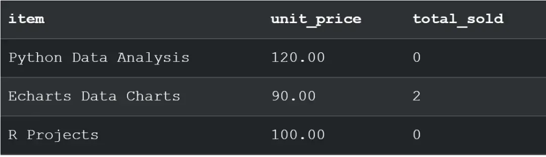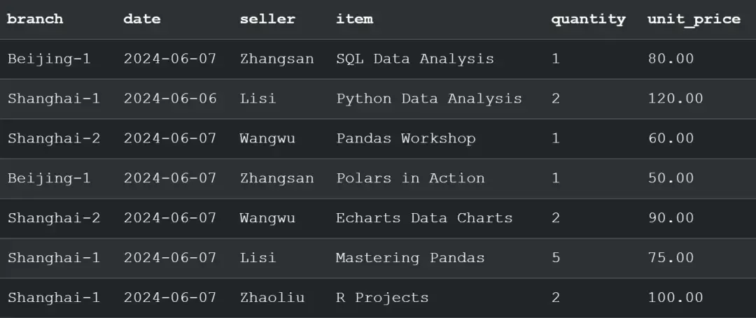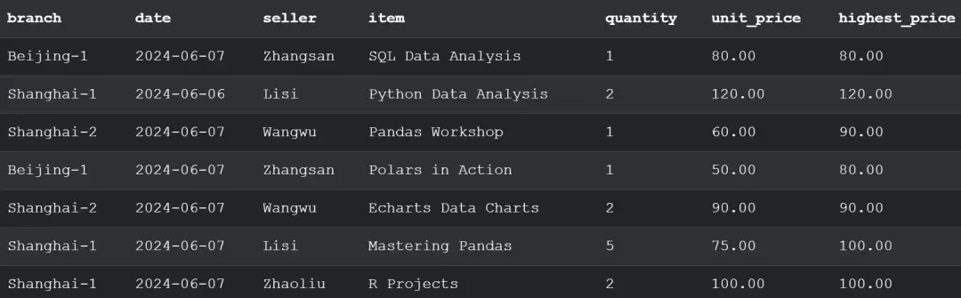 生成 sales 表的 SQL 代码如下。 复制1-- 创建名为sales的表 2CREATE TABLE sales ( 3 branch VARCHAR(50), 4 date DATE, 5 seller VARCHAR(50), 6 item VARCHAR(50), 7 quantity INT, 8 unit_price DECIMAL(10, 2) 9); 10 11-- 插入数据 12INSERT INTO sales (branch, date, seller, item, quantity, unit_price) 13VALUES 14 (Beijing-1, 2024-06-07, Zhangsan, SQL Data Analysis, 1, 80), 15 (Shanghai-1, 2024-06-06, Lisi, Python Data Analysis, 2, 120), 16 (Shanghai-2, 2024-06-07, Wangwu, Pandas Workshop, 1, 60), 17 (Beijing-1, 2024-06-07, Zhangsan, Polars in Action, 1, 50), 18 (Shanghai-2, 2024-06-07, Wangwu, Echarts Data Charts, 2, 90), 19 (Shanghai-1, 2024-06-07, Lisi, Mastering Pandas, 5, 75), 20 (Shanghai-1, 2024-06-07, Zhaoliu, R Projects, 2, 100);1.2.3.4.5.6.7.8.9.10.11.12.13.14.15.16.17.18.19.20.我们先看一个简单的例子。输出 sales 表中的原始数据记录,但要在 sales 表中再添加一列,显示当天(date)在同一分店中售出图书的最高价格。获取售价最高的图书价格可以使用如下 CTE。 复制1WITH highest AS ( 2 SELECT 3 branch, 4 date, 5 MAX(unit_price) AS highest_price 6 FROM sales 7 GROUP BY branch, date 8) 9SELECT 10 sales.*, 11 h.highest_price 12FROM sales 13JOIN highest h 14 ON sales.branch = h.branch 15 AND sales.date = h.date1.2.3.4.5.6.7.8.9.10.11.12.13.14.15.上述查询定义了名为 highest 的 CTE,这个虚拟表包含的列为 branch、date 和highest_price,分别表示分店的名称、销售日期和当天该分店销售的最高单价。 然后,在主查询中,高防服务器像使用常规表一样使用虚拟表 highest。 最后,将 highest 的查询结果与 sales 表进行连接。 查询的结果如下。