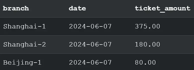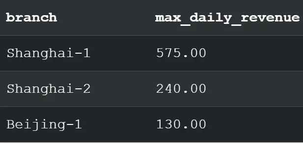 下面这个例子显示各分店最高的单日收入。 复制1WITH daily_revenue AS ( 2 SELECT 3 branch, 4 date, 5 SUM(unit_price * quantity) AS daily_revenue 6 FROM sales 7 WHERE EXTRACT(YEAR FROM date) = 2024 8 GROUP BY 1,2 9) 10SELECT 11 branch, 12 MAX(daily_revenue) max_daily_revenue 13FROM daily_revenue 14GROUP BY 1 15ORDER BY 2 DESC1.2.3.4.5.6.7.8.9.10.11.12.13.14.15.在这段代码中,首先定义名为 daily_revenue 的 CTE,包含的列为 branch、date 和 daily_revenue,数据记录为每家分店在 2024 年内每一天的日销售额。 然后,在主查询中,获取 2024 年每家分店的最高日销售额。 最后,按max_daily_revenue 降序排列输出数据。