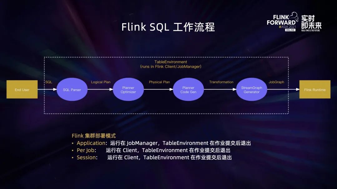 用户提交的 SQL 首先会被 Parser 解析为逻辑执行计划;逻辑执行计划经过 Planner Optimizer 优化,会生成物理执行计划;物理执行计划再通过 Planner CodeGen 代码生成,翻译为 DataStream API 常见的 Transformation;最后 StreamGraphGenerator 会将这些 Transformation 转换为 Flink 作业的最终表示 JobGraph 提交到 Flink 集群。 上述一系列过程都发生在 TableEnvironment 里面。取决于部署模式的不同,TableEnvironment 可能运行在 Flink Client 或者 JobManager 里。Flink 现在支持 3 种集群部署模式,包括 Application、 Per-Job 和 Session 模式。在 Application 模式下,TableEnvironment 会在 JobManager 端运行,而在其余两种模式下,TableEnvironment 都运行在 Client 端。不过这三种模式都有一个共同的特点,TableEnvironment 都是一次性的,会在提交 JobGraph 之后自动退出。