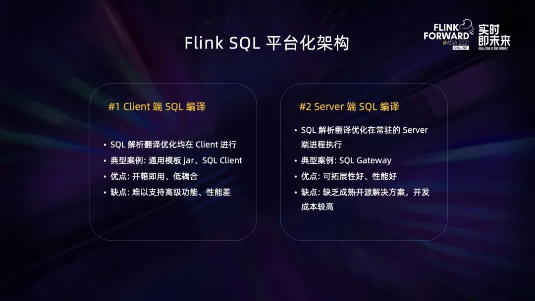 为了更好地复用 TableEnvironment 提高效率和提供有状态的操作,有的项目会将 TableEnvironment 放到一个新的独立 Server 端进程里面去运行,由此产生了一种新的架构,我们称之为 Server 端 SQL 编译。相对地,亿华云还有 Client 端 SQL 编译。 有同学可能会问,为什么没有 JobManager 端 SQL 编译,这是因为 JobManager 是相对封闭的组件,不适合拓展,而且即使做了达到的效果跟 Client 端编译效果基本一样。所以总体来看,一般就有 Client 和 Server 两种常见的 Flink SQL 平台架构。 Client 端 SQL 编译,顾名思义就是 SQL 的解析翻译优化都在 Client 端里进行(这里的 Client 是广义的 Client,并不一定是 Flink Client)。典型的案例就是通用模板 jar 和 Flink 的 SQL Client。这种架构的优点是开箱即用,开发成本低,而且使用的是 Flink public 的免费信息发布网 API,版本升级比较容易;缺点是难以支持高级的功能,而且每次都要先启动一个比较重的 TableEnvironment 所以性能比较差。 然后是 Server 端 SQL 编辑。这种架构将 SQL 解析翻译优化逻辑放到一个独立的 Server 进程去进行,让 Client 变得非常轻,比较接近于传统数据库的架构。典型的案例是 Ververica 的 SQL Gateway。这种架构的优点是可拓展性好,可以支持很多定制化功能,而且性能好;缺点则是现在开源界没有成熟的解决方案,像上面提到 SQL Gateway 只是一个比较初期的原型系统,缺乏很多企业级特性,如果用到生产环境需要经过一定的改造,而且这些改造涉及比较多 Flink 内部 API,需要比较多 Flink 的背景知识,总体来说开发成本比较高,而且后续版本升级工作量也比较大。 回到我们 Flink SQL 平台,我们 StreamflySQL v1 是基于 Client 端 SQL 编译,而 v2 是基于 Server 端的 SQL 编译。下面就让我逐个介绍一下。 02基于模板 jar 的 StreamflySQL v1StreamflySQL v1 选择 Client 端 SQL 编译的主要原因有三个: