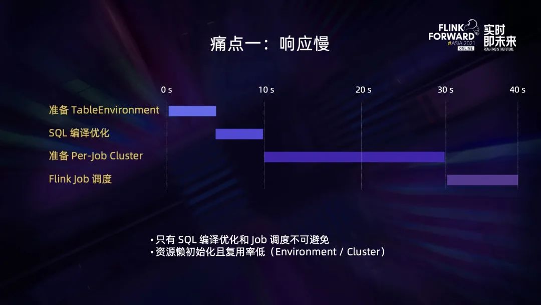 上图是 v1 版本的整体架构图。我们在主要在 Lambda 作业平台的基础上新增了 StreamflySQL 后端作为配置中心,负责根据用户提交的 SQL 和作业运行配置加上通用的模板 jar 来生成一个 Lambda 作业。 总体的作业提交流程如下: 用户在前端的 SQL 编辑器提交 SQL 和运行配置。StreamflySQL 后端收到请求后生成一个 Lambda 作业并传递配置 ID。然后 Lambda 启动作业,背后是执行 Flink CLI run 命令来提交作业。、Flink CLI run 命令会启动 Flink Client 来加载并执行模版 jar 的 main 函数,这时会读取 SQL 和配置,并初始化 TableEnvironment。TableEnvironment 会从 Catalog 读取必要的 Database/Table 等元信息。这里顺带一提是,在网易游戏我们没有使用统一的 Catalog 来维护不同组件的元信息,而是不同组件有自己的元数据中心,对应不同的 Catalog。最后 TableEnvironment 编译好 JobGraph,以 Per-Job Cluster 的方式部署作业。StreamflySQL v1 实现了 Flink SQL 平台从零到一的建设,满足了部分业务需求,但仍有不少痛点。 第一个痛点是响应慢。