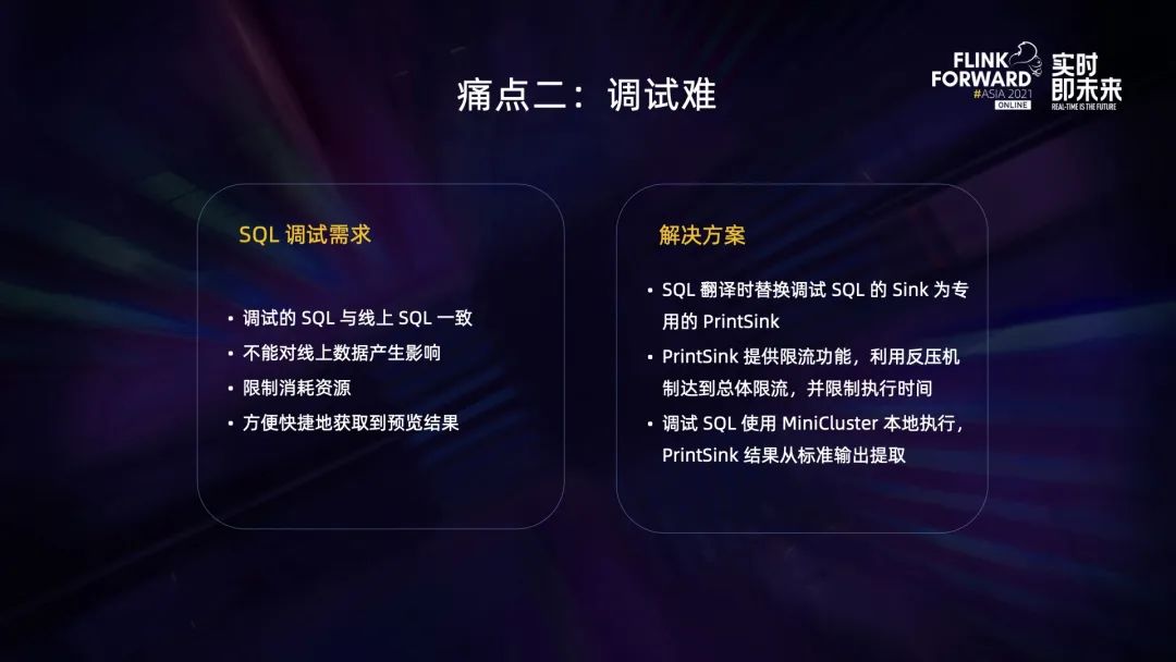 我们对 SQL 调试的需求有以下几点: 第一点是调试的 SQL 与线上的 SQL 要基本一致。第二点是调试 SQL 不能对线上的数据产生影响,它可以去读线上的数据,但不能去写。第三点,因为调试的 SQL 通常只需要抽取少量的数据样本就可以验证 SQL 的正确性,所以我们希望限制调试 SQL 的资源,一方面是出于成本的考虑,另外一方面也是为了防止调试的 SQL 与线上作业产生资源竞争。第四点,因为调试 SQL 处理的数据量比较少,我们希望以更快更便捷的方式获取到结果。在 v1 版本中,我们对上述需求设计了如下解决方案: 首先对于调试的 SQL,系统会在 SQL 翻译的时候将原来的一个 Sink 替换为专用的 PrintSink,这解决了需求中的前两点。然后对 PrintSink 进行限流,通过 Flink 的反压机制达到总体的限流,并且会限制作业的最长执行时间,超时之后系统会自动把作业结束掉,这解决了需求中的资源限制这点。最后为了更快地响应,调试的作业并不会提交到 YARN 集群上去运行,而是会在 Lamdba 服务器本地开启开启一个 MiniCluster 去执行,同时也方便我们从标准输出去提取 PrintSink 的结果,这点解决了需求中的最后一点。