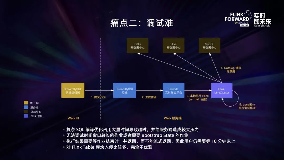 调试模式的架构如上图所示,比起一般的 SQL 提交流程,主要区别在于作业不会提交到 YARN 上,而是在 Lambda 服务器的本地执行,从而节省了准备 Flink 集群的开销,并且更容易管控资源和获取结果。 上述调试解决方案基本可用,但是实际使用过程中依然存在不少问题。 第一,如果用户提交的 SQL 比较复杂,那么 SQL 的编译优化可能会耗费比较久的时间,这会导致作业很容易超时,在有结果输出之前可能就被系统结束掉,同时这样的 SQL 也会给服务器造成比较大的压力。第二,该架构没法去调试时间窗口比较长的作业或者需要 Bootstrap State 的作业。第三,因为执行结果是在作业结束之后才批量返回的,不是在作业执行过程中就流式返回,因此用户需要等到作业结束——通常是 10 分钟以上才可以看到结果。第四,在 SQL 的翻译阶段把调试 SQL 的 Sink 替换掉,这个功能是通过改造 Flink 的 Planner 来实现的,相当于业务逻辑入侵到了 Planner 里面,这样并不优雅。第三个痛点是 v1 版本只允许单条 DML。