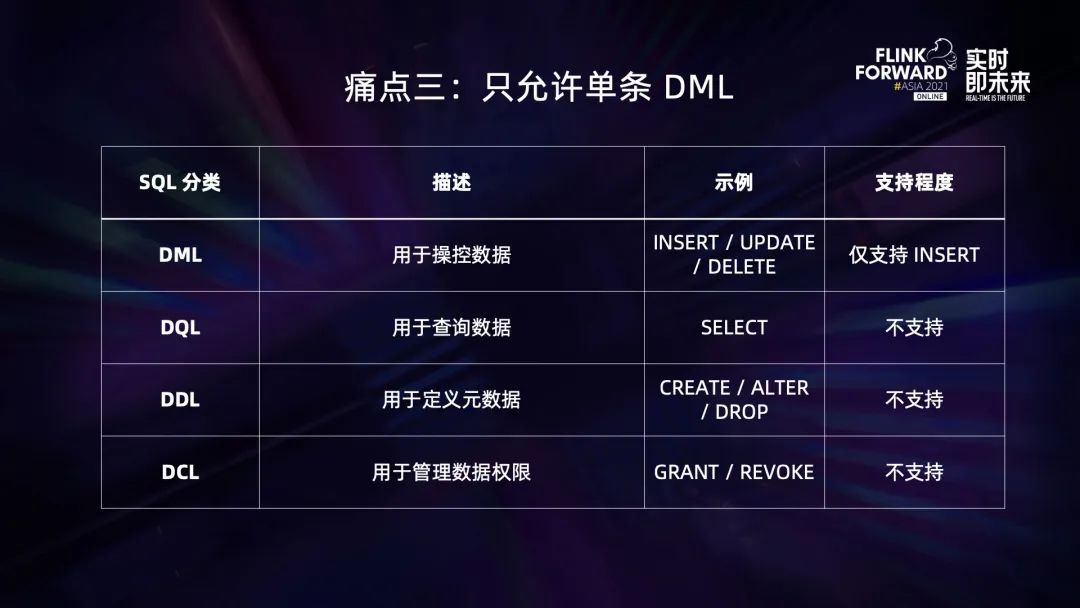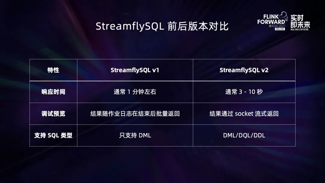 相比传统的数据库,我们支持的 SQL 语句是很有限的,比如,MySQL 的 SQL 可以分成 DML、DQL、DDL 和 DCL。 DML 用于操控数据,常见的语句有 INSERT / UPDATE / DELETE。StreamflySQL v1 只支持了 INSERT,这和 Flink SQL 是保持一致的。Flink SQL 用 Retract 模式 — 也就是类似 Changelog 的方式 — 来表示 UPDATE/DELETE,所以只支持 INSERT,这点其实没有问题。DQL 用于查询数据,常见语句是 SELECT。这在 Flink SQL 是支持的,但因为缺乏 Sink 不能生成一个有意义的 Flink 作业,所以 StreamflySQL v1 不支持 DQL。DDL 用于定义元数据,常见语句是 CREATE / ALTER /DROP 等。这在 StreamflySQL v1 版本是不支持的,因为模板 jar 调用 SQL 的入口是 sqlUpdate,不支持纯元数据的操作,而且为纯元数据的操作单独启动一个 TableEnvironment 来执行也是完全不划算。最后是 DCL,用于管理数据权限,比如 GRANT 跟 REVOKE 语句。这个 Flink SQL 是不支持的,原因是 Flink 目前只是数据的用户而不是管理者,DCL 并没有意义。综合来看,v1 版本只支持了单条 DML,这让我们很漂亮的 SQL 编辑器变得空有其表。基于以上这些痛点,我们在今年调研并开发了 StreamflySQL v2。v2 采用的是 Server 端 SQL 编译的架构。 03基于 SQL Gateway 的 StreamflySQL v2