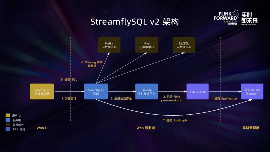 这是 StreamflySQL v2 的架构图。我们将 SQL Gateway 内嵌到 SpringBoot 应用中,开发了新的后端。总体看起来比 v1 版本要复杂,原因是原本的一级调度变成了会话和作业的两级调度。 首先用户需要创建一个 SQL 会话,StreamflySQL 后端会生成一个会话作业。在 Lambda 看来会话作业是一种特殊作业,启动时会使用 yarn-session 的脚本来启动一个 Flink Session Cluster。在 Session Cluster 初始化之后,用户就可以在会话内去提交 SQL。StreamflySQL 后端会给每个会话开启一个 TableEnvironment,负责执行 SQL 语句。如果是只涉及元数据的 SQL,会直接调用 Catalog 接口完成,如果是作业类型的 SQL,会编译成 JobGraph 提交到 Session Cluster 去执行。
