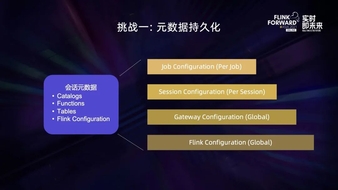 SQL Gateway 本身的元数据只保存在内存中,如果进程重启或是遇到异常崩溃,就会导致元数据丢失,这在企业的生产环境里面是不可接受的。因此我们将 SQL Gateway 集成到 SpringBoot 程序之后,很自然地就将元数据保存到了数据库。 元数据主要是会话元数据,包括会话的 Catalog、Function、Table 和作业等等。这些元数据按照作用范围可以分为 4 层。底下的两层是全局的配置,以配置文件的形式存在;上面两层是运行时动态生成的元数据,存在数据库中。上层的配置项优先级更高,可以用于覆盖下层的配置。 我们从下往上看这些元数据: 最底层是全局的默认 Flink Configuration,也就是我们在 Flink Home 下的 flink-conf yaml 配置。再上面一层是 Gateway 自身的配置,比如部署模式(比如是 YARN 还是 K8S),比如默认要出册的 Catalog 和 Function 等等。第三层是 Session 会话级别的 Session Configuraion,比如会话对应的 Session Cluster 的集群 ID 或者 TaskManager 的资源配置等等。最上面一层是 Job 级别的配置,包括作业动态生成的元数据,比如作业 ID、用户设置 checkpoint 周期等等。这样比较灵活的设计除了解决了元数据持久化的问题,也为我们的多租户特性奠定了基础。 第二个挑战是多租户。