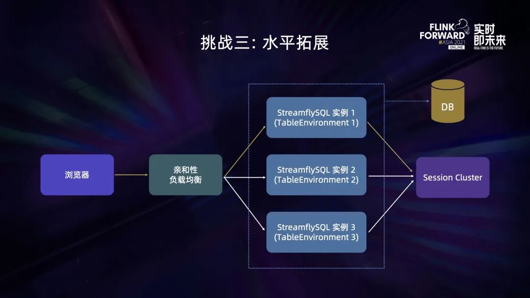 为了高可用和拓展服务能力,StreamflySQL 很自然需要以多实例的架构部署。因为我们已经将主要的状态元数据存到数据库,我们可以随时从数据库构建出一个新的 TableEnvironment,所以 StreamflySQL 实例类似普通 Web 服务一样非常轻,可以很容易地扩容缩容。 但是并不是所有状态都可以持久化的,另外有些状态我们故意会不持久化。比如用户使用 SET 命令来改变 TableEnvironment 的属性,比如开启 Table Hints,这些属于临时属性,会在重建 TableEnvironment 后被重置。这是符合预期的。再比如用户提交 select 查询做调试预览时,TaskManager 会与 StreamflySQL 后端建立 socket 链接,而 socket 链接显然也是不可持久化的。因此我们在 StreamflySQL 的多实例前加了亲和性的负载均衡,按照 Session ID 来调度流量,让在正常情况下同一个用户的请求都落到同一个实例上,确保用户使用体验的连续性。 第四个挑战是作业状态管理。
