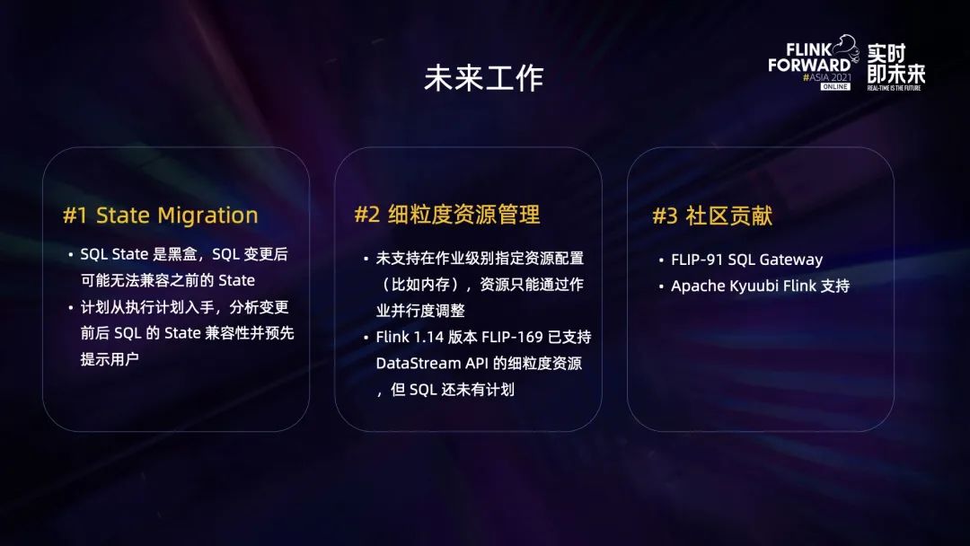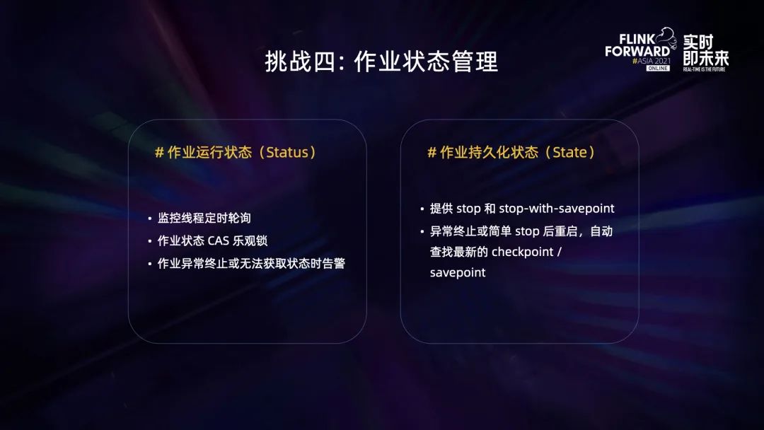 其实这里的状态一词是双关,有两个含义: 第一个含义是作业的运行状态。SQL gateway 目前只是提交 SQL 并不监控后续的运行状态。因此,StreamflySQL 设置了监控线程池来定时轮询并更新作业状态。因为 StreamflySQL 是多实例的,它们的监控线程同时操作同一个作业的话,可能会有更新丢失的问题,所以我们这里使用了 CAS 乐观锁来保证过时的更新不会生效。然后我们会在作业异常退出或者无法获取状态时进行告警,比如 JobManager 进行 failover 的情况下,我们无法得知 Flink 作业的状态,这时系统就会发出 disconnected 的异常状态告警。第二个含义是 Flink 的持久化状态,即 Flink State。原生的 SQL gateway 并没有管理 Flink 的 Savepoint 和 Checkpoint,因此我们加上了 stop 和 stop-with-savepoint 的功能,并强制开启 retained checkpoint。这使得在作业遇到异常终止或者简单 stop 之后,再次重启时系统可以自动查找到最新的 checkpoint。这里我可以分享下我们的算法。其实自动查找最新 checkpoint 的功能 Lambda 也有提供,但是 Lambda 假设作业都是 Per-Job Cluster,因此只要查找集群 checkpoint 目录里最新的一个 checkpoint 就可以了。但这样的算法对 StreamflySQL 却不适用,因为 Session Cluster 有多个作业,最新的 checkpoint 并不一定是我们目标作业的。因此,我们改为了使用类似 JobManager HA 的查找方式,先读取作业归档目录元数据,从里面提取最新的一个 checkpoint。 04未来工作