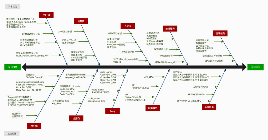 从图中可以看出,上传失败存在几个关键的环节中:用户侧、网络节点、入口网关、后端服务。 可能是用户侧本地异常,如机器内存不足,小程序闪退。可能是用户网络不稳定,还有可能是用户在上传图片的过程中,中途将小程序切换到后台,重新唤起小程序续传失败。为了请求的安全和加速,在请求打到源站入口网关前,是先走运营商传输节点,传输节点也对接了多家运营商,传输不稳定或命中防火墙策略也会造成上传失败。入口网关用的是 kong,如果路由策略配置异常,或者 Kong 节点异常,或者某个 upstream 节点异常都会造成上传失败。后端图片服务,如果处理能力不足,负载高,进程夯住,或其他异常也会造成上传失败。经过思考,如何做到普适性呢,就要面临以下几个问题。 异常能被有效地观测到吗?异常定位对经验要求很高,如何减少传承成本?异常分析有哪些提效的工具链,能平台化吗?异常千千万万,再加上排练组合,真的能通过数据分析出来吗?异常分析平台增加了学习成本,会不会增加工程师负担,会质疑研发平台的受益?深入思考,有点细思极恐,异常定位好难呀,提效异常定位更难! 二、追本溯源,能否提效异常定位?很多工程师在分析异常的时候,往往聚焦单次问题,一上来就陷入个案分析的细节,耗神耗力,心态都会查崩。 随着网站拓扑的演进,异常定位也越来难,很多公司都在推进 SRE 体系建设,其中对可观测性呼声也越来越高。异常如何被量化,被观测。这其实是一个“工程问题”。 所谓工程问题本质上是数学,需要在一个定义良好的环境里,用定义良好的参数描写一个定义良好的问题。引起网站异常的的原因有各种各样,就像诊断患者一样。统计分析健康的人和病患各项身体基能指标的差异性,从而判断病患程度及探究病因。 结合我的一些日常排障经验,来看一下异常定位这个工程问题。 异常定位需要在一个参照系中进行,通过可视化界面去呈现 SLI 的波动性,而 SLI 的波动性往往是和引起异常的根因相关联。分析不同 SLI 波动振幅差异性大小,从而推断异常的可能性原因。 简单来说,就是给异常进行数学建模,并关联到可观测的 SLI 上。透过 SLI 的表象反查异常原因。说起来比较简单,和医生诊断一样,往往一种病理现象对应了不同的病因,而同一种病因也会有不同的表象。有急性有慢性,还有扩散传递性,一种病变可能引发一系列身体其他的病变,溯源病因可能需要多次会诊。当然经验越丰富,数据越多,模型分析也就越准确。