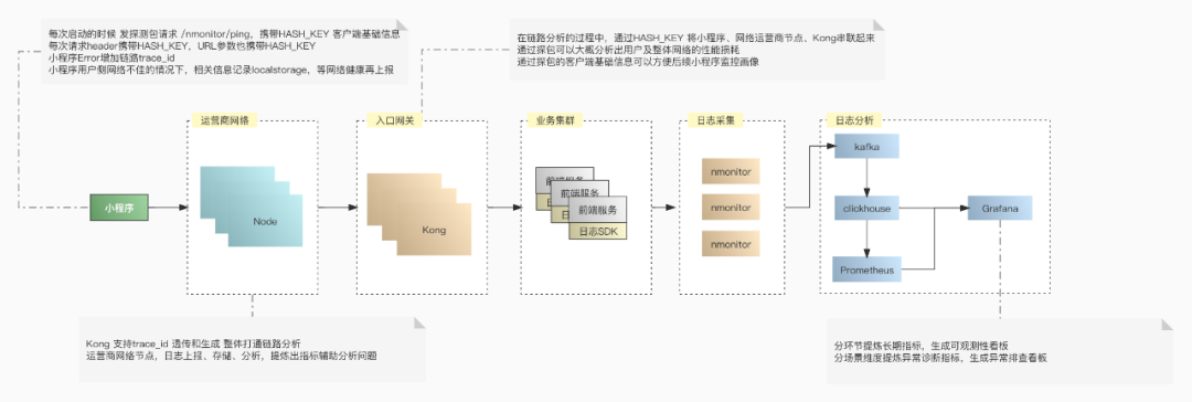 为了异常的可观测性,需要按不同的维度去细分 SLI,这次上传图片异常是由于微信灰度了特定的基础库,改造后需要收集终端相关信息,如设备平台,设备型号,微信版本,微信基础库版本以及小程序版本。 在为上传图片链路建模分析的时候,也一直在考虑能否将这些经验延伸到小程序整体的可观测性中呢? 于是进一步细化了分析维度,按不同的小程序包,统计了不同 code 码、路由、domain 的请求数及时延。这样就能更好地支持下钻,并能迁移到整个小程序异常分析中。接下来一起看一下如何落地改造各个环节以便 SLI 的收集。 四、顺势而为,落地整体链路改造1、用户侧每次小程序启动的时候发起一个探包请求,会上报一下版本信息(平台/版本/微信版本/微信基础库版本/小程序包名/小程序版本),当然为了安全审计不会收集用户隐私相关的信息。探包请求还额外获得了小程序启动频次的粗略统计数据。通过 hash 算法生成版本信息的指纹 hash_key,后续的用户请求 url 和 http header 中都携带这个 hash_key。通过 hash_key 关联 kong 日志和版本信息,从而能提炼出终端不同维度的 SLI。为了将整个链路串联起来,小程序每次请求生成 trace_id,并通过 header 透传下去。小程序网络不佳的时候,会先将 Error 等日志信息暂存到 LocalStorage 队列中,等有网了再次上报。所有记录日志的地方都会记上 trace_id,方便后续异常定位分析。2、网络节点新增运营商标识,方便对比分析不同运营商传输的可用性。收集运营商的日志,存储到 Clickhouse 中,方便后续分析,尽可能让网络传输节点可观测。3、入口网关按业务类型拆分 route_name,如上传,订单提交等等。route_name 支持打标签,如业务部门,所属页面等,方便告警监控及识别到的风险通知到具体的业务部门。插件支持生成 trace_id 或透传已生成的 trace_id,打通 KongLog 和后端服务 TraceLog。4、后端服务增加日志埋点,分析不同图片尺寸大小的上传下载相关的指标。定义好不同的 code 码,方便异常定位分析。5、可观测平台鉴于之前研发了强大的分析器,只用添加分析,告警规则就能满足这次场景需求。为了节约研发成本,SLI 存储到了 Clickhouse,可视化基于 Grafana 写 SQL 绘制。新增地理位置分析,将请求 ip 转换成经纬度,方便提炼地区维度的 SLI。整个小程序日志上报的流程如下: