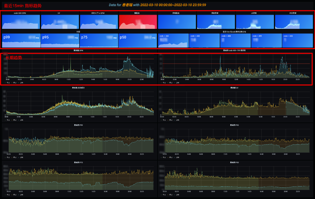 首页看板用于大盘投屏使用的,包括两个部分,上部分是最近 15min 的瞬时数据,大于某个经验阈值会标红显示,下部分是长期趋势,比对同比和环比,各个面板都支持下钻分析。 首页一定要清爽,列出最关心的 SLI,如 QPS/UV、慢路由请求数、异常请求数。根据时延和 ErrorCode 分布,下钻到具体的分析页面。也可以通过分析长期趋势,查看小程序整体的状态,如慢路由风险是否在增加。 2、长期趋势分析