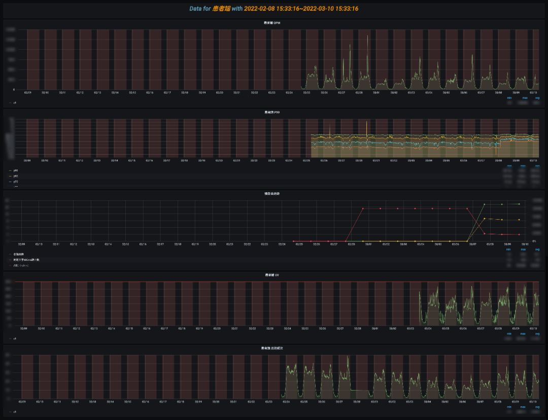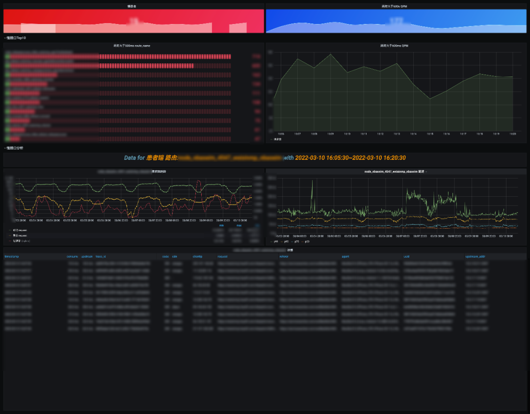 在改造的过程中也遇到了不少问题。 控制 Error 信息大小。单条信息过大会导致 Flume 收集异常,重复收集获丢失日志。采样上报,控制频次。一般异常发生可能会产生连锁反应,瞬时产生大量日志,需要避免频繁上报导致用户带宽的消耗。降噪处理。如腾讯周期性安全扫描可能会产生一些干扰异常,如 499 等,会影响用户维度 SLI 的准确性,需要识别这些干扰进行降噪处理。提升分析性能,简化 SQL,很多分析需要连表查询,数据量增大的时候,会存在性能问题。于是添加了大量视图,重建了不同维度的索引表。将数据按分钟维度聚合成 SLI,避免了分析查询原始日志的性能开销。接下来,一起看一下最终成果。 五、应运而生,建设可观测性平台在整个改造的过程中,大家也看到了基本上都是一次投入,后续持续受益。整个流程运转起来后,后续就是提炼感兴趣的 SLI,并基于 Grafana 展示即可。 整个可观测性平台是基于 Grafana+Clickhouse+Prometheus 构建的,符合低代码平台研发,只要会写 SQL 就行。