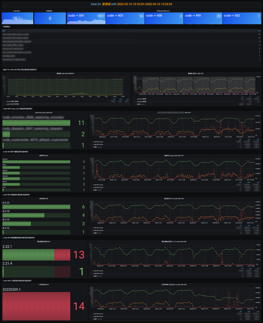 在首页可以观察异常 code 分布,下钻到具体的 code 分析页,这里模拟分析一下 code=400 量增加的场景。 整个过程其实是一个模型匹配问答的模式。 是否需要人工介入?假定 SLO 为 code=400 的错误率<0.5%,p = total_400_request / (total_200_request + total_400_request),如 code=200 访问量是 10K,如果这时候 400 访问量达到 500 则需要人工介入排查。同比环比是否具有差异性?分析当日请求判断是否具有突发性,分析一周数据判断是否具有周期性。比如每晚直播访问量就会到峰值,这个点错误率增加了可能是机器负载过高了,从而给排查提供一个方向。是否具有路由差异性?是大面积无异常报错还是特定的路由异常,结合一周趋势,从而给出排查方向。同理分析异常特征是否具有终端平台、微信版本、微信基础库版本、小程序版本差异性?整个差异性分析的过程,其实是判断差异显著程度的过程,这里可能存在认知误区,如 iPhone 异常数比 oppo 大,很可能是 iPhone 总体访问基数大,这个时候其实是看各自长期占比趋势的。如果判断出来特定 route_name 异常具有显著差异,可能是有突出抓取,或者业务代码异常,或者业务机器负载过高等等,这时候需要下钻分析。可下钻到”NO5.路由详情分析“,”NO6.抓取分析“。 4、慢路由风险分析