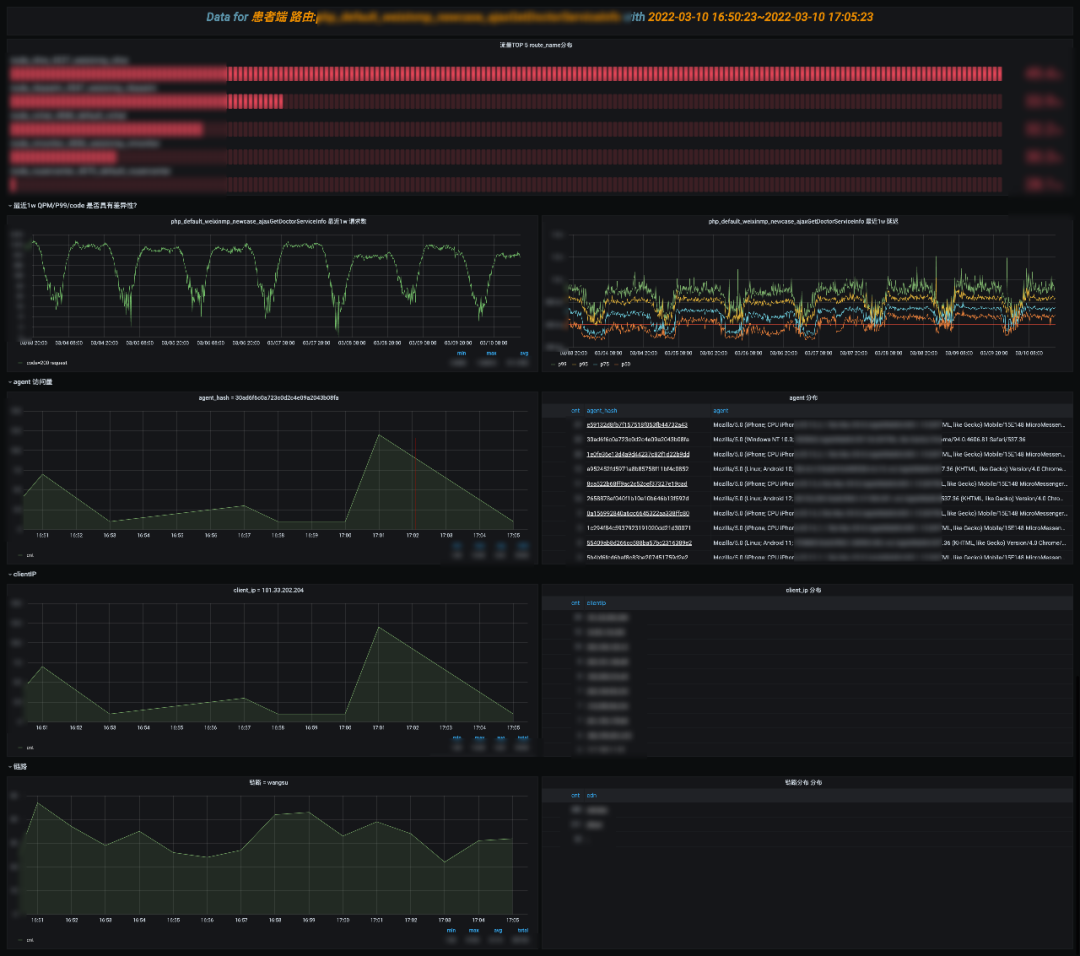 这部分依然在做问答题,主要是围绕给定的 route_name 展开分析的。 code 分布是否具有显著差异性,如 P99 时延增加了,可能是缓存命中率 code=304 过低了。同比环比是否具有差异性?尤其是周期性存在明显波动,或突发波动的会被优先怀疑。由于是在分析具体的路由,首要怀疑是否有线上变更,如图中 P99 具有显著差异性,是因为当天业务有修改线上配置造成的。结合链路分析慢的问题,最终优化了链路请求解决了这个问题。是否是抓取造成的?另外一个常见的异常是由于蜘蛛突发抓取造成的,为了资源最大利用率,一般不会冗余过多的机器,当蜘蛛突发抓取冷数据的时候可能会造成波动。这部分主要是分析 UA,为了避免 UA 过长带来的分析性能损耗,采用了 hash ua 的方式。结合 ua 占比,ClientIP 占比,评估是否存在抓取的可能,具体可以下钻到”NO6.抓取分析“。是否存在地域差异性?如北京用户异常占比过高,可能是北京链路出现了异常。异常分布运营商节点是否存在显著差异?比如腾讯回源造成缓存穿透。异常分布在后端节点上是否具有显著差异性?从而判断是否存在机器问题。这部分可以继续往机器的维度下钻,分析是 CPU 或其他资源异常。如果以上常见场景都没命中,可以分析客户端相关信息是否具有显著差异性。6、抓取分析