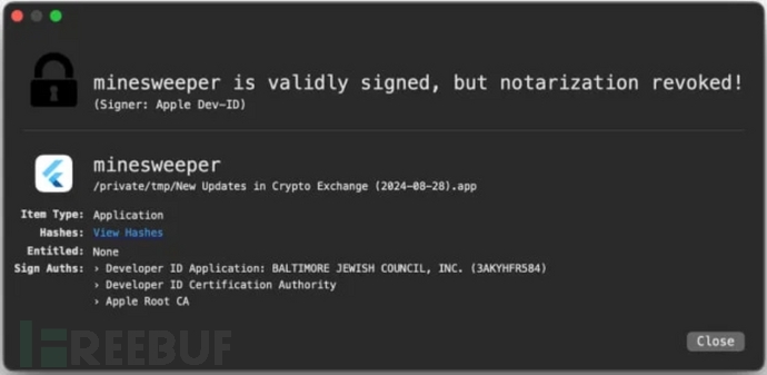 Flutter 应用程序布局 在进一步分析其中一款名为 New Updates in Crypto Exchange (2024-08-28)的应用程序时,Jamf 发现 dylib 中的混淆代码支持 AppleScript 执行,使其能够执行从命令和控制 (C2) 服务器发送的脚本。该应用程序打开了一个适用于 macOS 的扫雷游戏,其代码可在 GitHub 上免费获得。 Jamf 发现的云服务器 6 个恶意应用程序中有 5 个具有用合法的开发人员 ID 签名,并且恶意软件已通过公证,这意味着这些应用程序被苹果的自动化系统扫描并被认为安全。