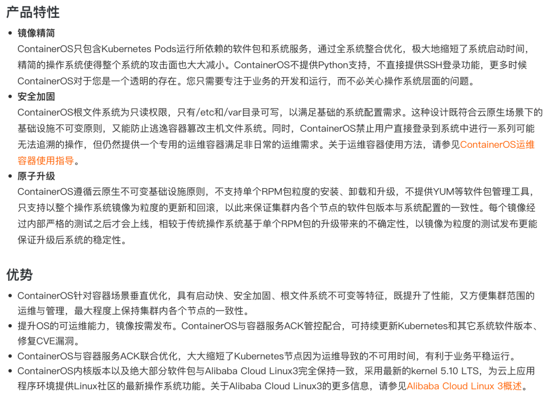你把生产环境的主子们装进集装箱,通过容器镜像对部署方式进行标准化,谁也甭想做非标的操作,再使用 Pod 对应用进行部署,再也不去关心应用在哪个 Node 上启动,这一切自有牧场(Kubernetes)自行处理。一个 Pod 异常了?没关系,删掉看看,下次起来又是一个全新的应用。丝毫不会影响到牧场的正常运转。 一切丝般顺滑,岁月静好。午夜时分,电话响起,线上告急。你从千呼万钉中醒来,睡眼朦胧,手忙脚乱。 恍惚之间,终于梳理清楚发生了什么,原来是不知何处流量涌现,节点雪崩。而你就像一个下水道小工疏通马桶一般,大力出奇迹,扩容机器,恢复服务。pending Pod 消失不见,警告消除。次日,你再也不想重现午夜凶铃,但陷入深思,身为牧场主的你,逐渐意识到一个灯下黑的问题。你可以轻松的同质化对待每一头牛,但你无法同质化整个牧场。 2.牧养真正的基础设施几番梳理,你找到了问题的关键:尽管可以放牧式管理 Pod,但是机器的运维却还是宠物式的。你依然会悉心照料每个机器:提前规划、取一个名字、单独控制规格、挑选操作系统,甚至还有几台深得你爱,嘘寒问暖,日夜牵挂,拥有单独的内部昵称代号。作为业界领先的牧场主,你决心改造自己的牧场,如果能像管理 Pod 一样管理 Node 是不是一个好主意?如果 Node 异常直接删除 Node,等着弹出新的?还没想完,你后背有些发凉,你还没有像信任容器一样信任虚机,虽然你深知重启可解决 90% 的故障,而重装系统可以解决 99% 的故障。思来想去,你依然想做些尝试,稍加思考,锁定痛点有二: 机器按需快速弹缩,同质管理OS 镜像化:快速、安全、不可变3.驯服虚机经过调研,你发现事情并不像原来设想的那样深不可测,主流云厂商早就提供了野生工具,你只需要稍加驯服,便可以为自己的牧场服务。云厂商们很早便推出了弹性伸缩组,可以按照负载和期望维护虚拟机的数目。而阿里云也有自己的实现(ESS),可以无需人工干预的根据规则对 ECS 进行扩缩容。你看到了希望,这不就是 Node 的 Deployment 吗?但是只是扩容虚拟机对你来说并没有什么价值,你深知需要的是牛圈,而不是木材,你需要对他们进行驯服。这时,你转头看到了你的 Kubernetes 集群,灵感蹦出,为何要直面虚拟机呢,只要新扩容出的机器能被纳管到集群中不就解决了基本问题。说干就干,通过 AutoScaling 定义了启动命令,开机后进行标准化安装和执行 kube join 动作。当机器开机不久,就可以出现在 Kubernetes 集群中。你感觉距离目标进了一步。 4.驯服 OS很快,你又发现了一个新的问题,传统的 OS 启动和容器实在无法比拟,明明所有的依赖都在容器内部,而且所有的应用都已经在容器内运行,但你还是不得不为 OS 内置的、没人使用的服务买单,这些服务拖慢了启动速度,还引入了安全漏洞。而且,总是有人意识不到同质化管理的好处,时不时有人上机器做一些不可知的修改,导致你每次想释放虚机时需要去群里喊一喊,避免碰到什么神奇的 Bug。自寻烦恼,你苦笑道。你打算驯服 OS,对传统的 OS 进行剪裁,除了容器依赖的东西全部清理掉,说不好能大大加快机器的启动速度。还有,最好能在啥地方加个告示,敬告大家不要在机器上做写操作,避免释放机器时文件的丢失。有天,你发现了阿里云的 ContainerOS,一个针对容器剪裁和优化的操作系统,你不需要亲自动手剪裁了,甚至都不再需要加一个告示,因为 RootFS 都是只读的,连 SSH 都不会默认打开,从根本上杜绝了非标操作。