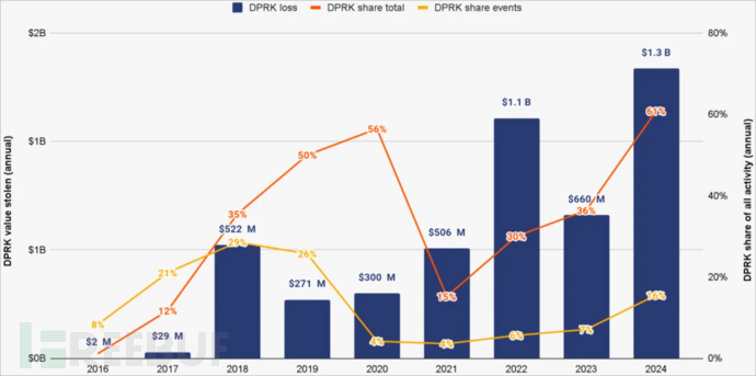 Chainalysis在报告中写道:“在2023年,与曹县有关的黑客通过20起事件窃取了约6.605亿美元;2024年,这一数字增加到13.4亿美元,共发生47起事件,价值增长了102.88%。”分析师还指出,曹县黑客在2024年进行了更频繁的攻击,这表明他们具备更高的大规模攻击执行能力。 通过对区块链证据的分析和从日本交易所到货币混合服务的资金流动,DMM比特币的劫案被归因于曹县黑客。
