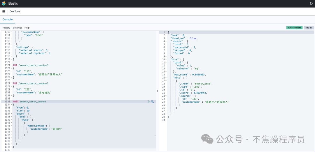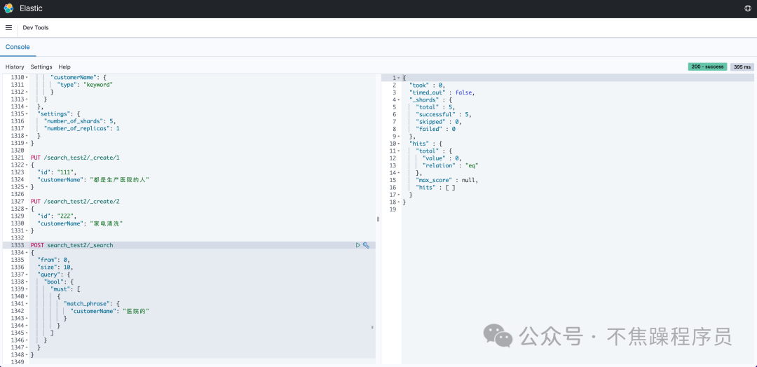 场景2:创建一个mapping,采用默认分词器,然后插入两条数据。注意:被搜索的字段先采用keyword类型。 复制# 创建mapping,这里的香港云服务器customerName先使用text类型 PUT /search_test2 { "mappings": { "properties": { "id": { "type": "keyword" }, "customerName": { "type": "keyword" } } }, "settings": { "number_of_shards": 5, "number_of_replicas": 1 } } # 插入2条数据 PUT /search_test2/_create/1 { "id": "111", "customerName": "都是生产医院的人" } PUT /search_test2/_create/2 { "id": "222", "customerName": "家电清洗" } # match_phrase短语匹配查询,可以查出结果 POST search_test2/_search { "from": 0, "size": 10, "query": { "bool": { "must": [ { "match_phrase": { "customerName": "医院的" } } ] } } }1.2.3.4.5.6.7.8.9.10.11.12.13.14.15.16.17.18.19.20.21.22.23.24.25.26.27.28.29.30.31.32.33.34.35.36.37.38.39.40.41.42.43.44.45.46.47.48.49.以上操作结果显示查不到数据。如下图: