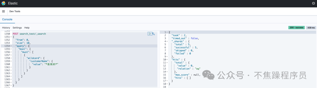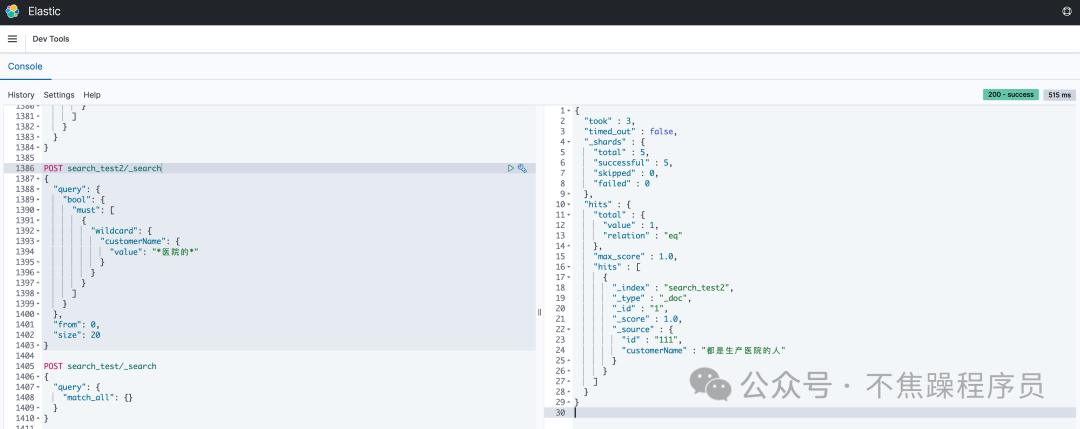注意:如果将DSL查询语句改成只查“医”,就可以查到数据,这与分词器有关。默认分词器将每个字都切成分词。 复制# Wildcard查询 POST search_test/_search { "from": 0, "size": 10, "query": { "bool": { "must": [ { "wildcard": { "customerName": { "value": "*医*" } } } ] } } }1.2.3.4.5.6.7.8.9.10.11.12.13.14.15.16.17.18.19.场景2:创建一个mapping,采用默认分词器,然后插入两条数据。注意:被搜索的字段先采用keyword类型。使用上文已经创建的索引search_test2。 复制POST search_test2/_search { "from": 0, "size": 10, "query": { "bool": { "must": [ { "wildcard": { "customerName": { "value": "*医院的*" } } } ] } } }1.2.3.4.5.6.7.8.9.10.11.12.13.14.15.16.17.18.以上操作结果显示可以查到数据,如下图: