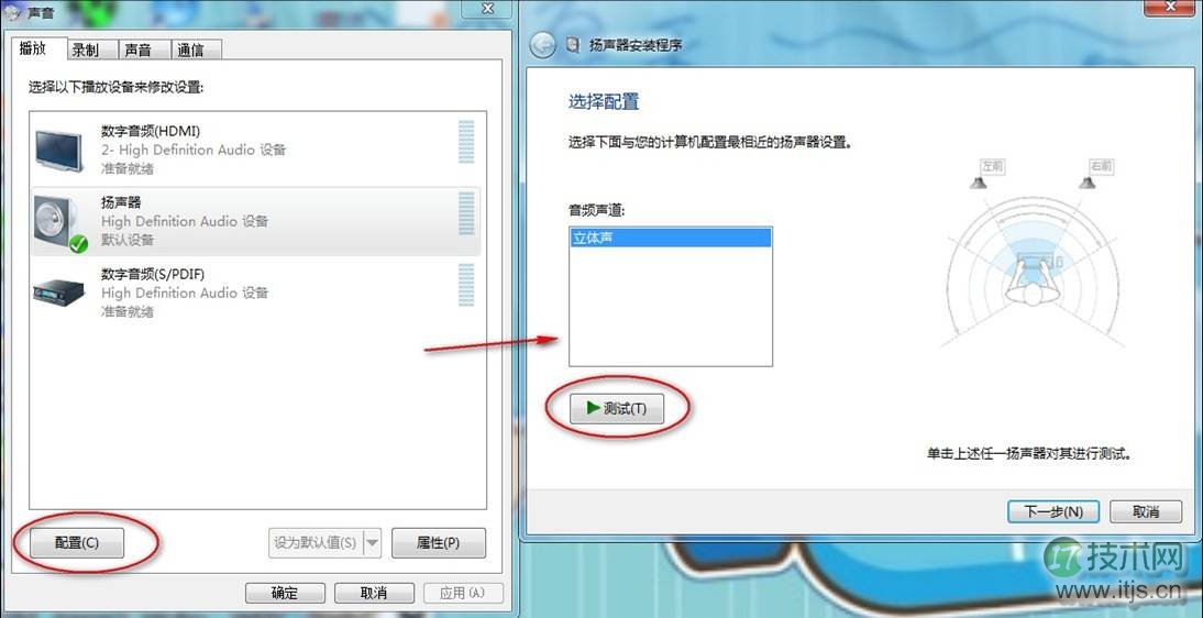 在播放中,笔记本两叭选择扬声器,个喇个无点击配置,有声出现右图,解决点击测试即可。云服务器统下