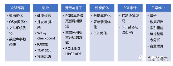 在PG数据库的运维中,从一个ORACLE DBA的角度,我也总结了一些日常运维与优化的工作内容。因为今天下午我还要赶到东莞去参加华为的鲲鹏昇腾开发者峰会,所以今早的事情比较多,我就不展开介绍了,如果大家有兴趣,明后天我会把上面这个片子详细地介绍一下。大家有兴趣的话,就在下面留言吧。 关于留言,我简单说几句,因为怕麻烦,我没有开启留言讨论的公众浏览功能,因此你们给我的留言我都是可以看见的,不过其他朋友可能看不见。年纪大了,只想静静地写点东西,没有精力去就某些观点争论与辩论,大家请包涵。  |