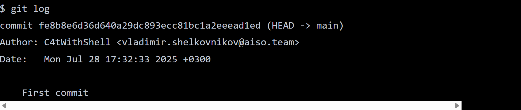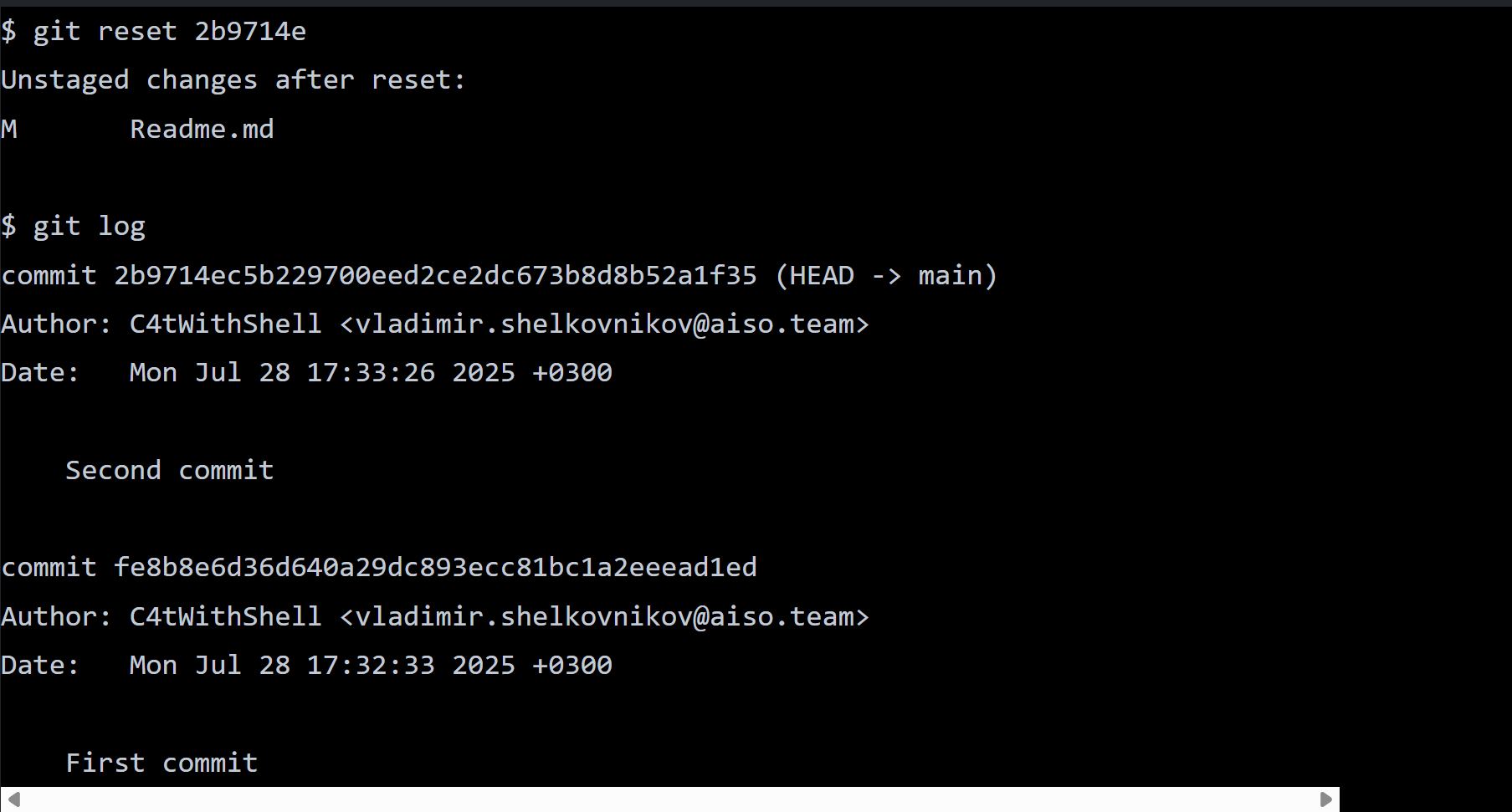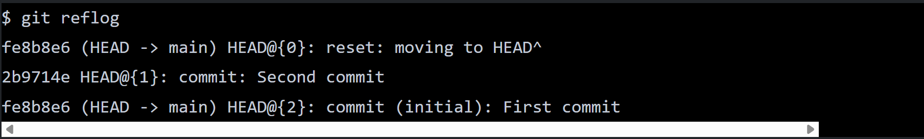 HEAD 是一个位于仓库内 .git/HEAD 文件中的指针。这个文件通常包含对当前分支的引用(例如,ref: refs/heads/main),或者如果你处于分离的 HEAD(detached HEAD)状态,则包含一个特定的提交哈希值。 让我们使用 git reset HEAD^ --hard 重置(reset)到第一个提交。