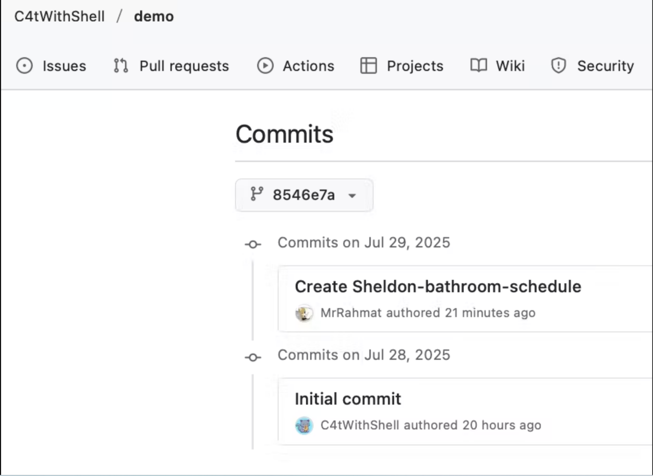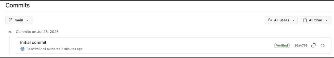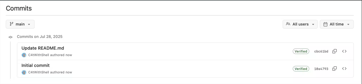 让我们看看提交哈希值。Git 同时支持哈希值的完整和缩短版本: 完整哈希值 (Full hash) 缩短版本 (Short version) fe8b8e6d36d640a29dc893ecc81bc1a2eeead1ed f38b8e6 2b9714ec5b229700eed2ce2dc673b8d8b52a1f 2b9714e Git 中的每个提交都有一个唯一的哈希值作为其“ID”。该哈希值是根据整个提交内容计算出来的,包括: 文件和目录结构(“树”对象)提交信息元数据,如作者、提交者和时间戳父提交的哈希值Git 默认使用 SHA-1(或可选地使用实验性功能 SHA-256)。你通常不需要完整的哈希值—Git 允许你使用缩短版本(通常 4-7 个字符就足够了)。在我的例子中,是 f38b 和 2b97。 这就是 Git 本地工作的方式。 但是 GitHub 呢?这就是事情变得有趣的地方。 GitHub 呢? GitHub 作为一个构建在 Git 之上的免费源码下载分布式平台,不仅继承了 Git 的去中心化机制,还引入了其自身的复杂性和风险层。 让我们重新审视之前的实验。 我创建了一个公共仓库并添加了两个提交: