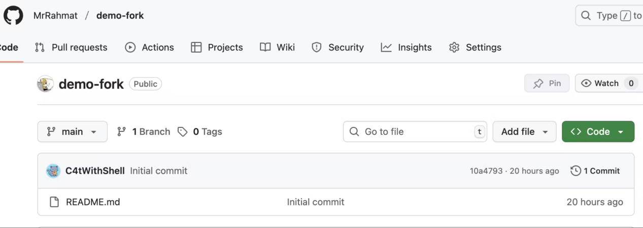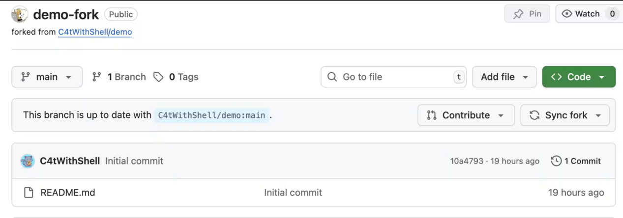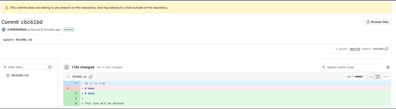 GitHub 警告: “此提交不属于此仓库的任何分支,可能属于仓库外部的某个分支(fork)。” 但整个提交内容仍然可用。 公共仓库(Public repositories)由于 GitHub 是一个分布式平台,我们可以将这个想法扩展到连接的仓库—上游(upstreams)仓库及其分支(forks)。 我能访问已删除分支(fork)中的提交吗?我分叉(fork)了我的演示仓库,在上面工作,并错误地添加了一个新的 .md 文件。