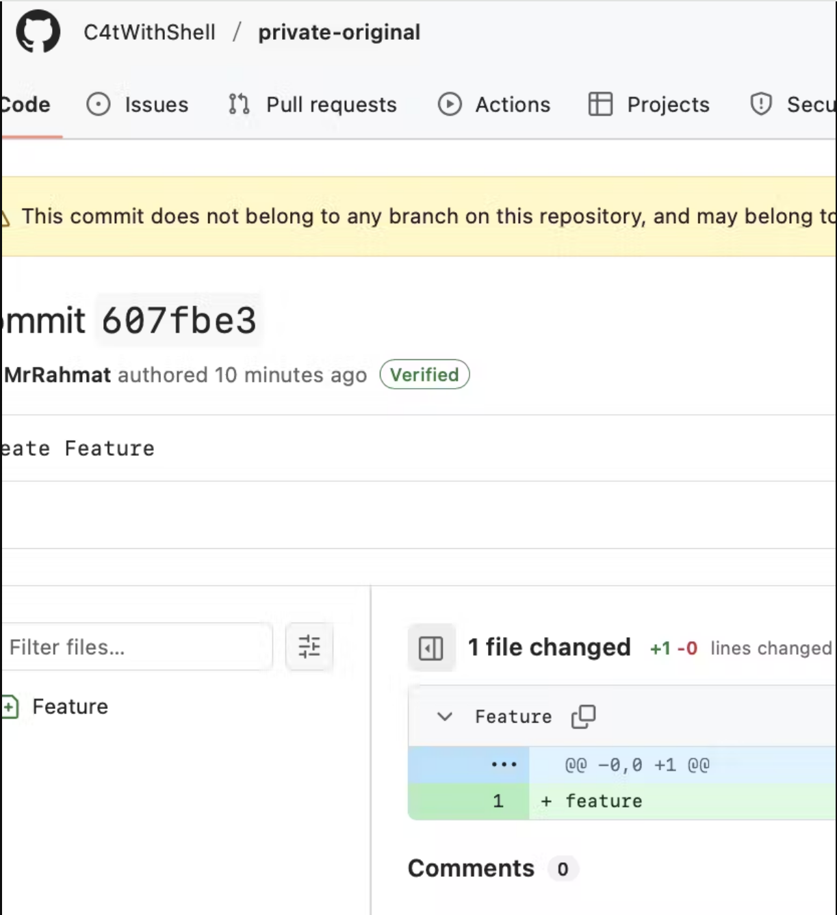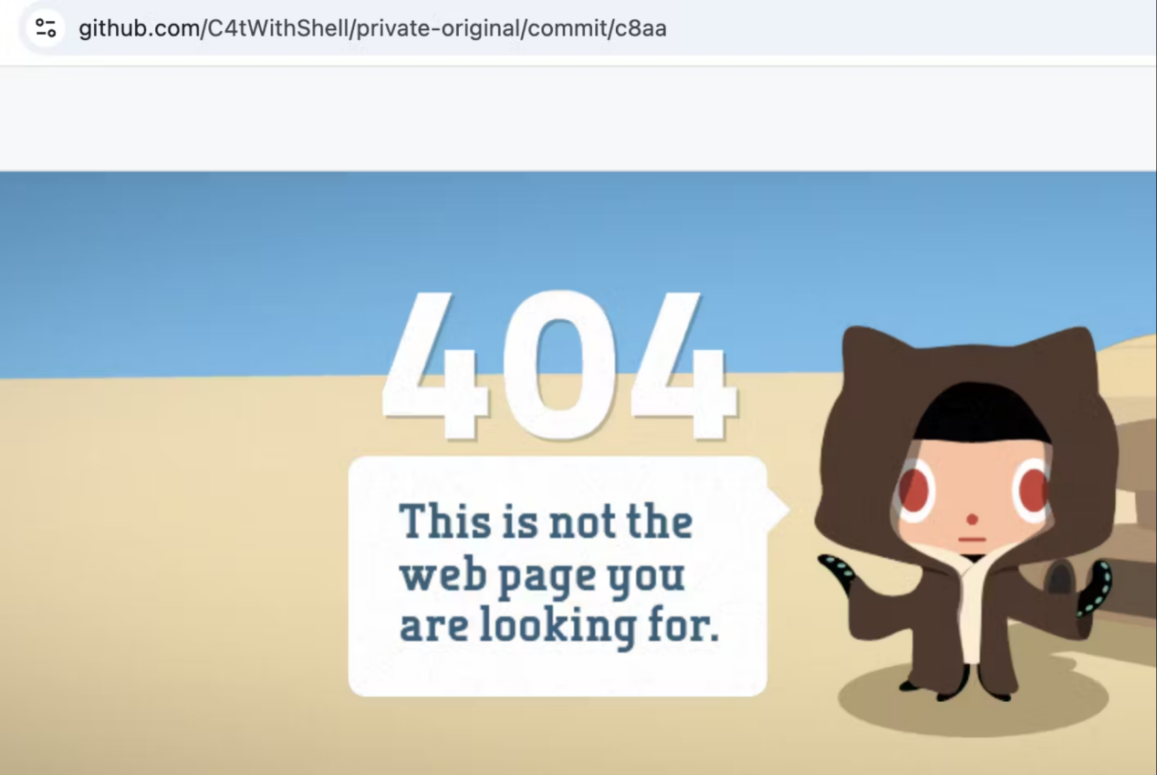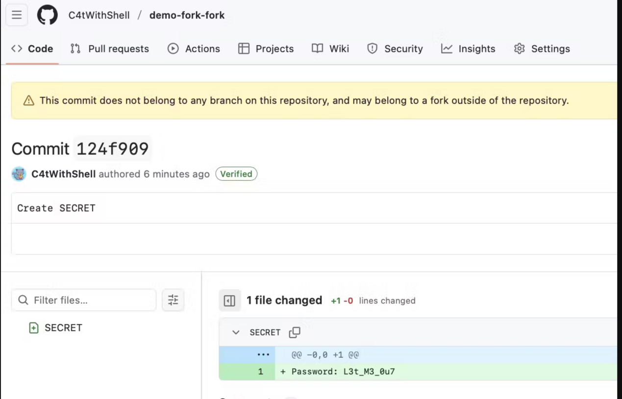 即便如此,我仍然可以从原始仓库使用其简短的 SHA 访问这个提交。 至少在这种情况下,可见性是受控的——分支无法公开,访问仅限于协作者(collaborators)。 但真正的问题在这里...