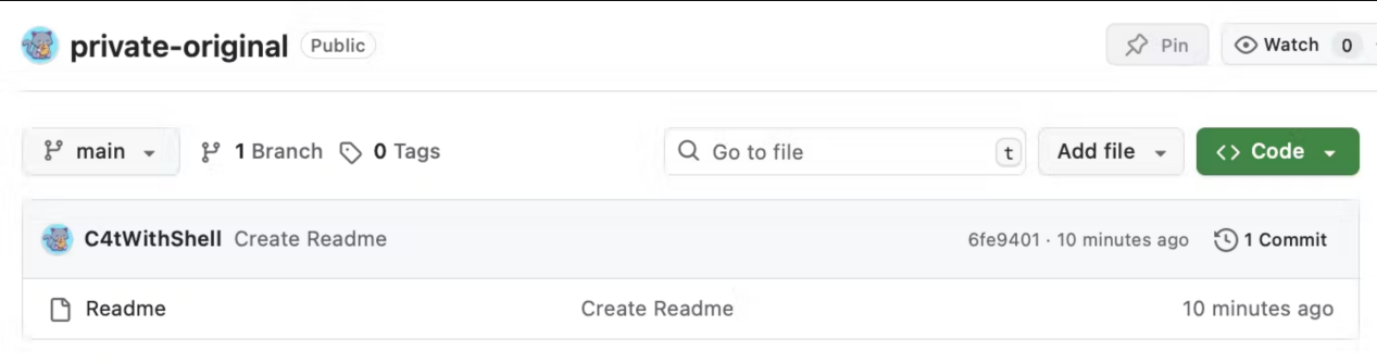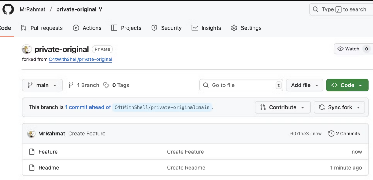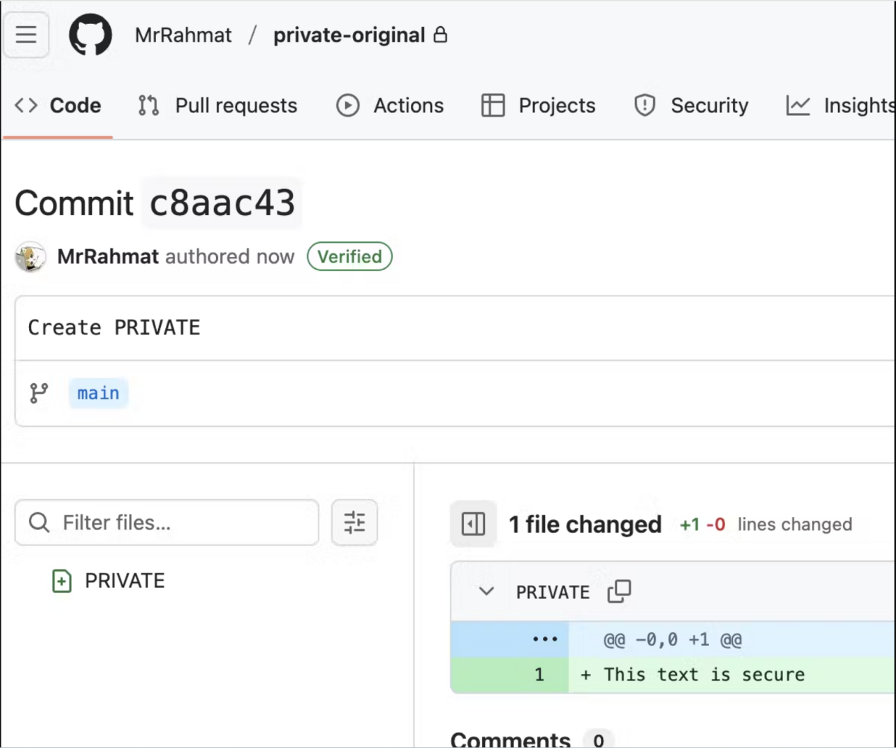 它显示: 谁fork了该仓库;提交如何在不同分支(forks)间产生分歧;存在于分支(forks)中但不存在于主仓库中的提交。因此,当有人分叉(fork)一个仓库时,GitHub 会跟踪父子关系。即使分支(forks)被删除或设为私有,只要: 该分支曾经是公开的;在分支被删除/设为私有之前提交已被推送。那么,它们可能仍然在网络图(network graph)中被跟踪。GitHub 存储的提交哈希值,如果你知道 SHA,仍然可以访问,这是一个已知的元数据泄露途径。 它会影响私有仓库吗? 让我们用一个私有仓库试试。 我创建了一个私有仓库并fork了它。该分支保持私有状态,无法将其设为公开。我在分支中添加了一个额外的文件。