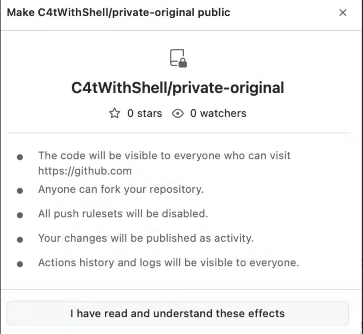 我见过一些公司开源其内部仓库。在这样做之前,他们通常会彻底清理主仓库。 但是分支(forks)呢?当一个私有仓库变为公开时: 原始仓库的分支网络在发布的那一刻被冻结。在私有分支(forks)中发布之前所做的所有提交都可能变得公开可见。GitHub 不会警告你这一点。因此,即使你的主仓库是干净的,你也可能正在暴露先前私有分支中的秘密。