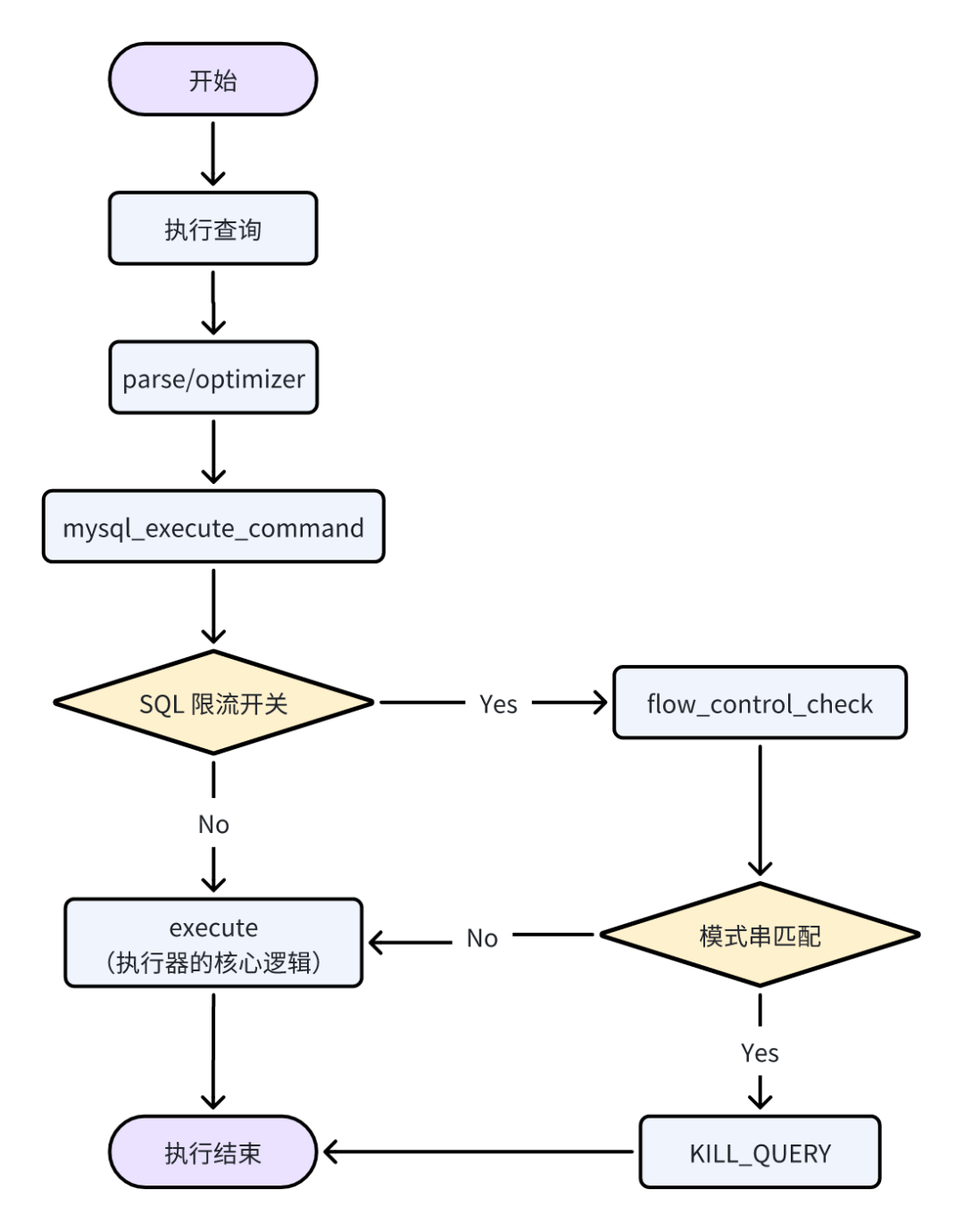 总体架构如图所示,SQL限流的主要功能在执行器工作阶段通过限流规则与查询串的匹配来实现。 流程图