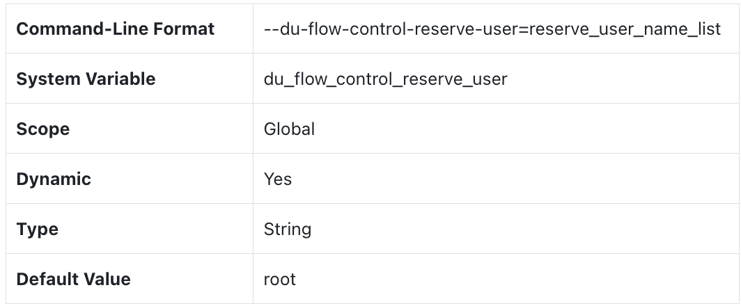 限流功能对于预留用户不生效。 预留用户参数以字符串的形式接受输入,如果存在多个预留用户,使用 , 进行分隔。 在服务启动时,需格式化该参数,后续在做限流判断时,需要根据格式化之后参数识别是否是预留用户,如果是预留用户,则不进行限流操作,无需进行后续的限流规则匹配。 预留用户参数接受NULL和空串 ,当该参数为NULL或空串时,表明所有用户都不是预留用户。 对于预留用户字符串的处理,与MySQL社区对于用户名的处理逻辑保持一致,即忽略每个用户名前后的无意义字符(如空格、换行等),保留用户名之间的无意义字符。 分隔符设置命令(du_flow_control_delimiter)