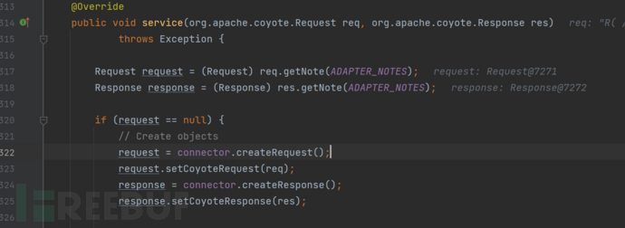 所以现在我们的目的是获取到AbstractProtocol$ConnectionHandler类的global属性值,也即是获取到AbstractProtocol这个类对象。 在调用这一步之后看起,发现了在CoyoteAdapter#service方法中,存在有Connector对象的操作。