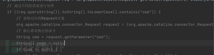将具体逻辑放在了static代码块中。 值得注意的有两点 在进行connector的筛选中,调用了getScheme().toLowerCase().contains("http")方法来帅选和http相关的连接器。 在命令执行的位置,通过判断有无特征来决定是否执行命令。